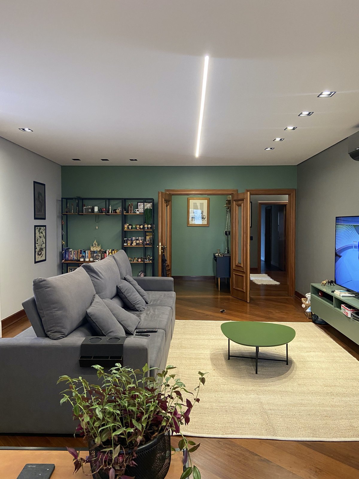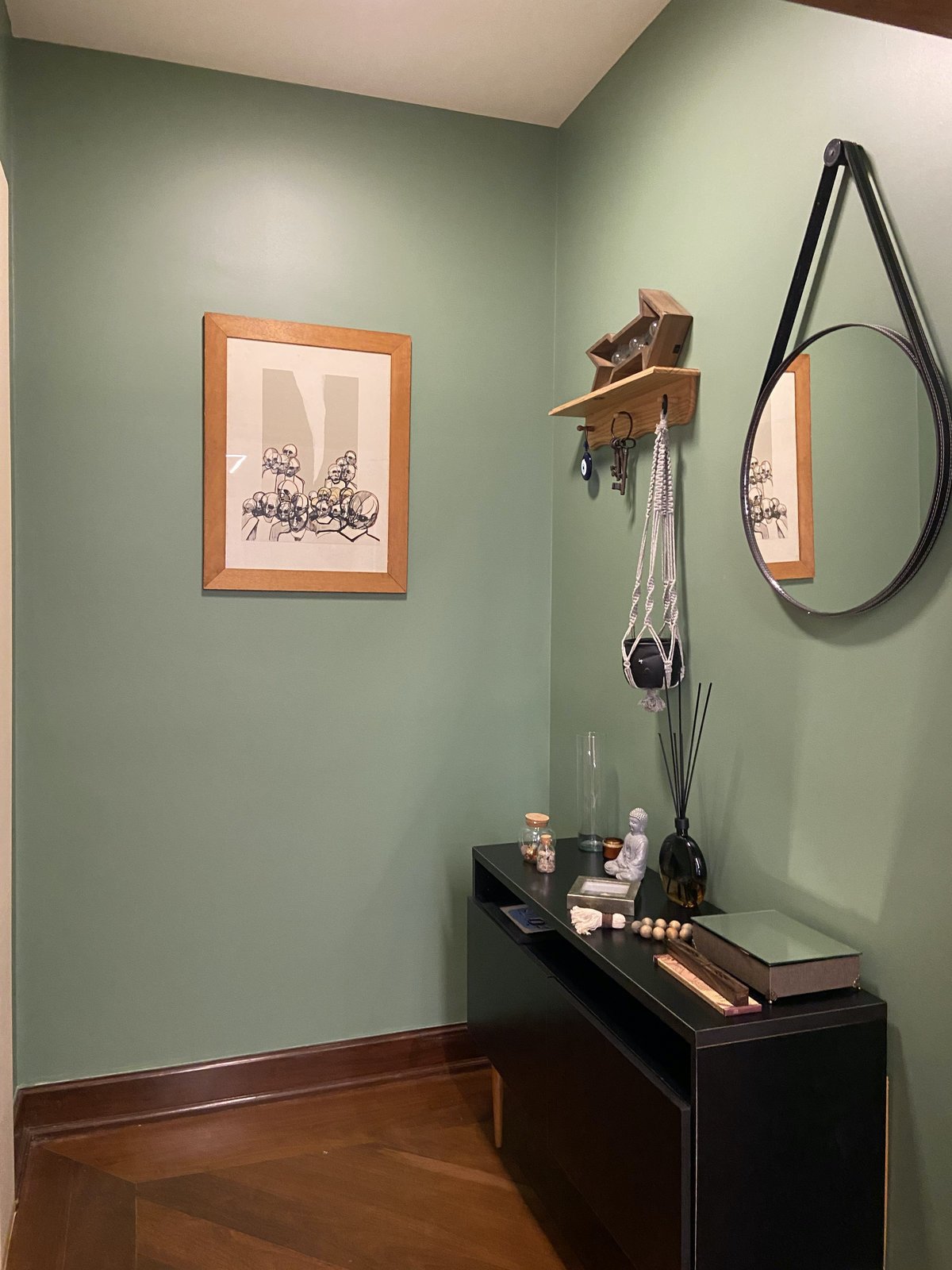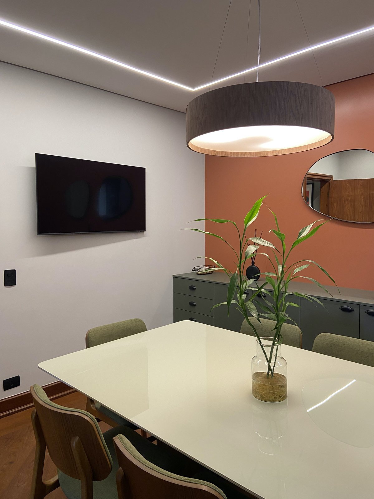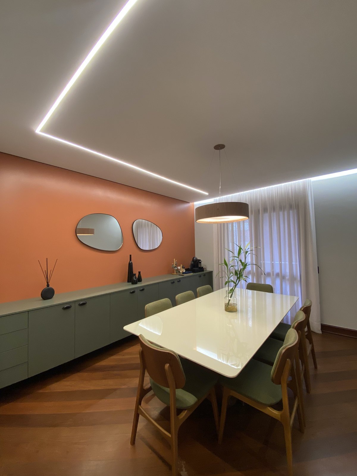Fizemos um retrofit nesse apartamento que já tinha uma arquitetura muito legal, com ambientes muito espaçosos, e utilizamos os tons solicitados também que era o laranja e o verde e detalhes em preto, lembrando um pouco o industrial.