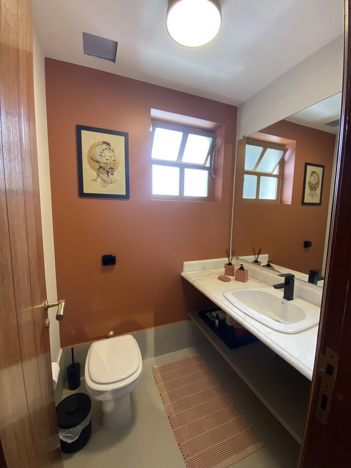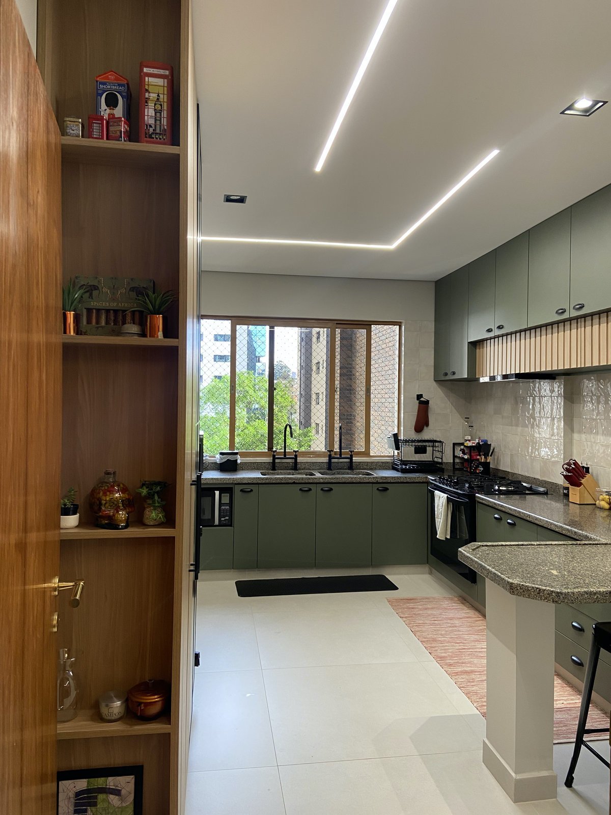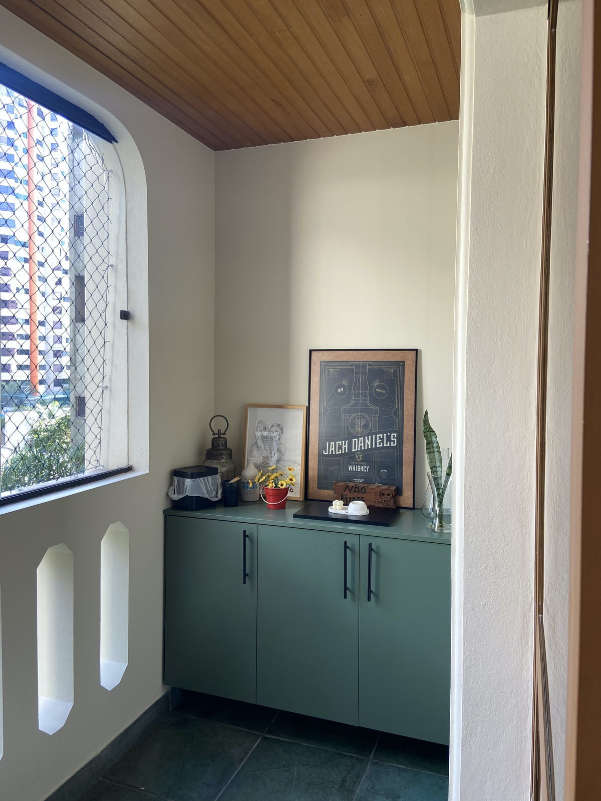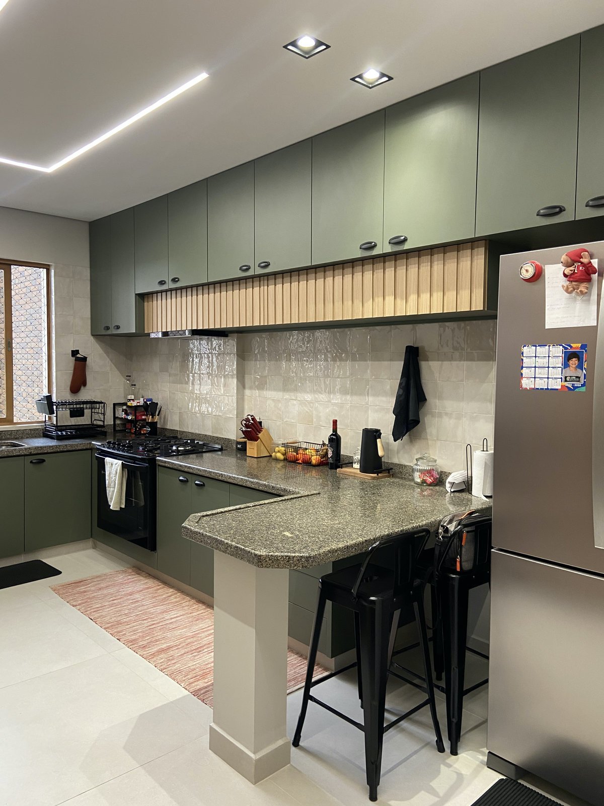 Fizemos um retrofit nesse apartamento que já tinha uma arquitetura muito legal, com ambientes muito espaçosos, e utilizamos os tons solicitados também que era o laranja e o verde e detalhes em preto, lembrando um pouco o industrial.