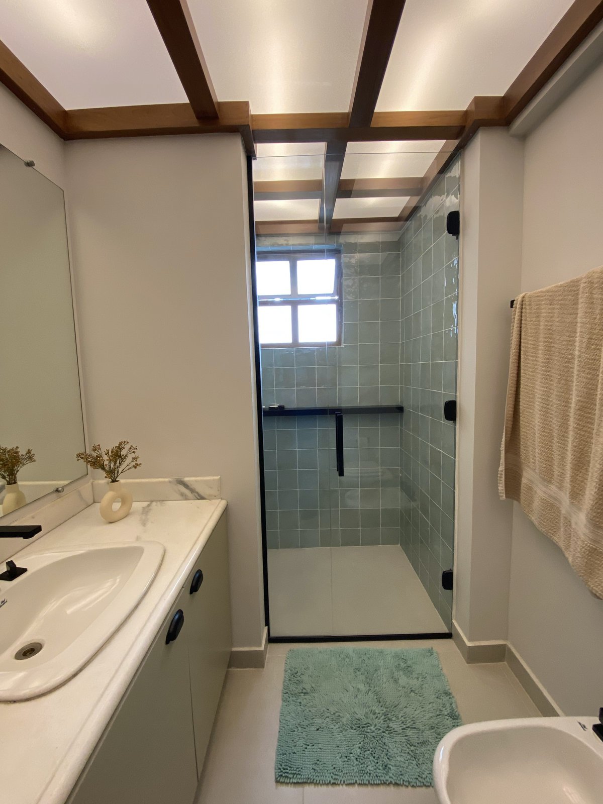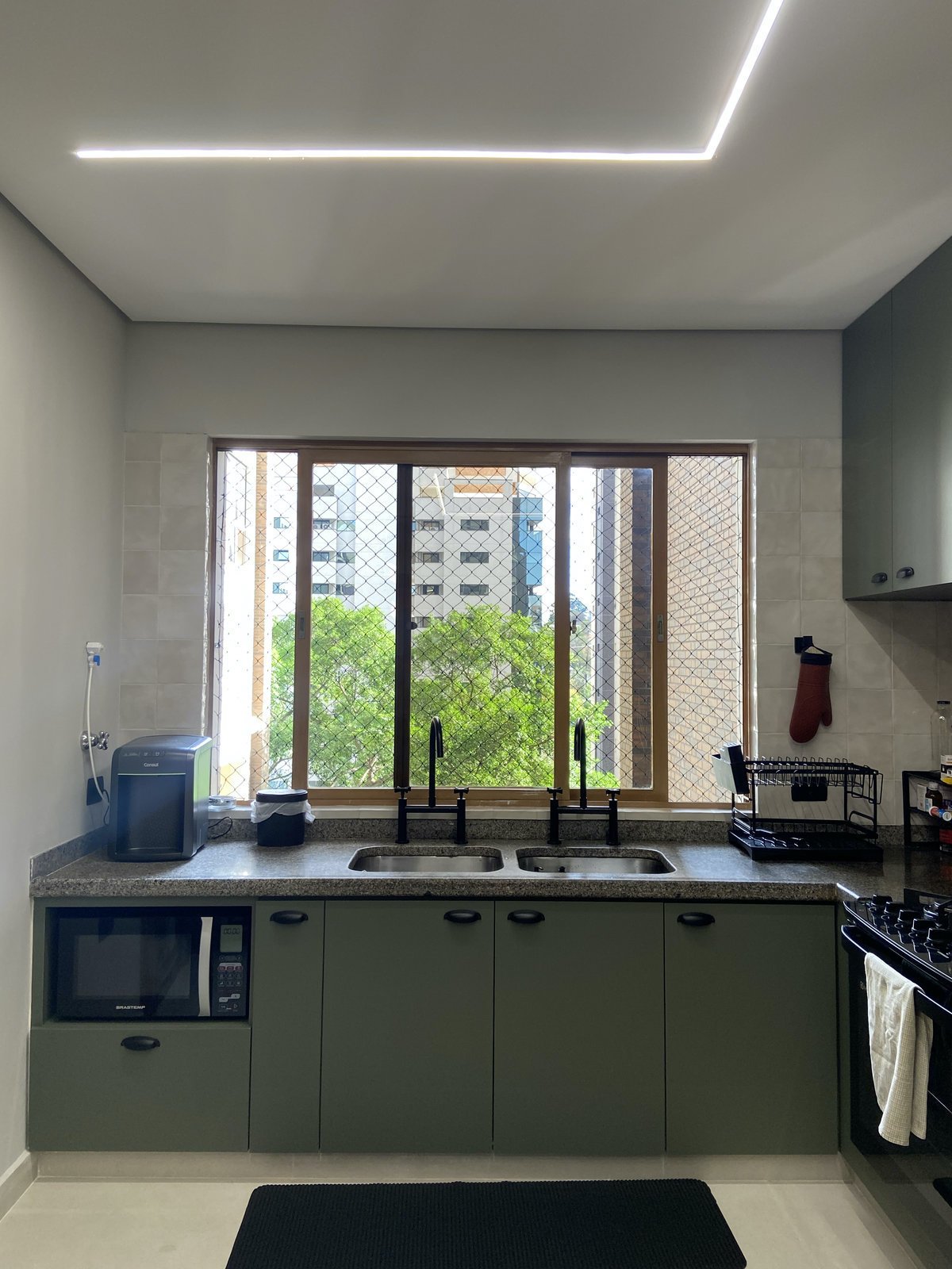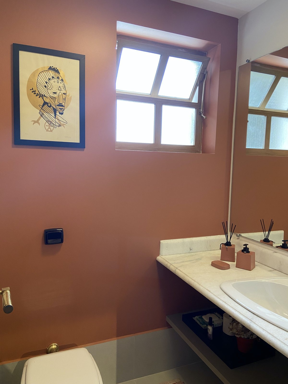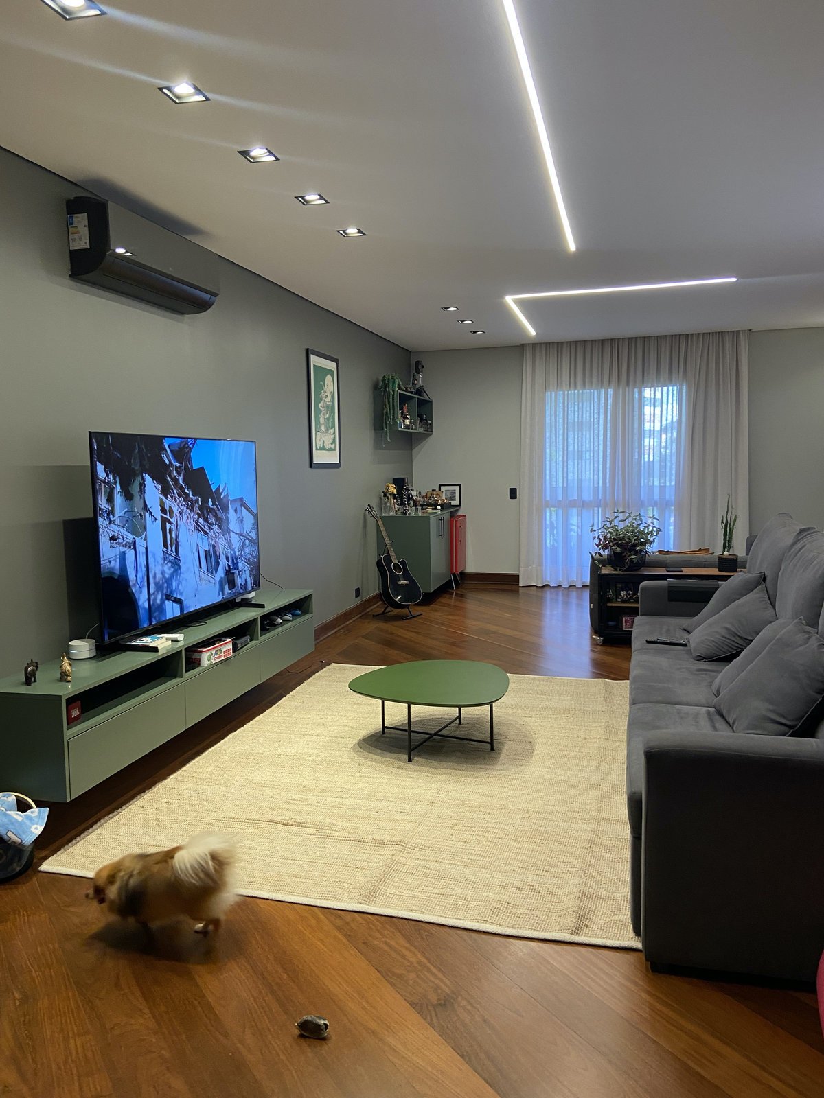 Fizemos um retrofit nesse apartamento que já tinha uma arquitetura muito legal, com ambientes muito espaçosos, e utilizamos os tons solicitados também que era o laranja e o verde e detalhes em preto, lembrando um pouco o industrial.